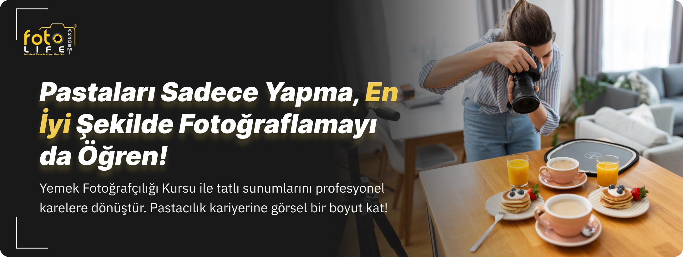 Foto Life Akademi, MEB onaylı yemek fotoğrafçılığı kursu ile pasta ve tabak sunumlarını profesyonelce çekmeyi öğreten, Google’da en çok yorum alan fotoğrafçılık kurumlarından biridir. Kurs süresince ışık yönetimi, styling, kompozisyon ve mobil çekim teknikleri gibi başlıklarda eğitim verilmektedir.