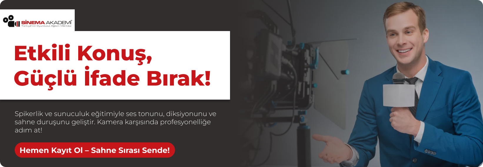 - Sinema Akademi – Spikerlik, sunuculuk, diksiyon, metin okuma, kamera önü duruş ve beden dili alanlarında birebir uygulamalı MEB onaylı kurslarıyla sektöre doğrudan hazırlık sunar.